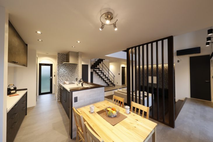 ダイニングテーブルとリビングの間は格子を間仕切りにしました。空間を分ける&目隠しにもなります。