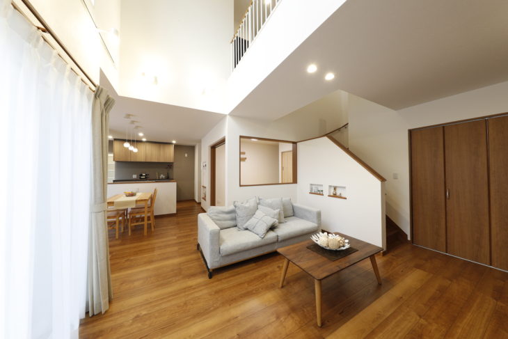 吹き抜けのある広々としたリビング。2階廊下の手摺りもホワイトにして、色味をホワイトとブラウンで統一しました。