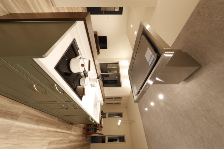 こだわりのアイランドキッチン。グリーンの扉が室内にマッチしています。