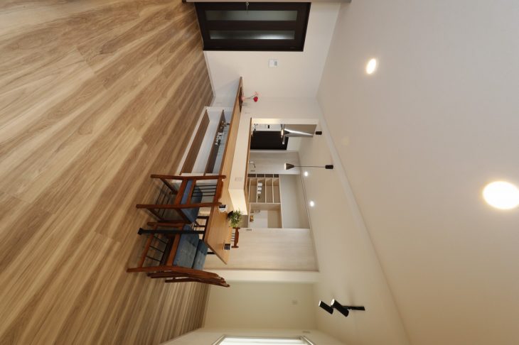 テレビ台背面のデザインにこだわり、間接照明を施しました。2階に続く階段は、扉で遮ることができます。